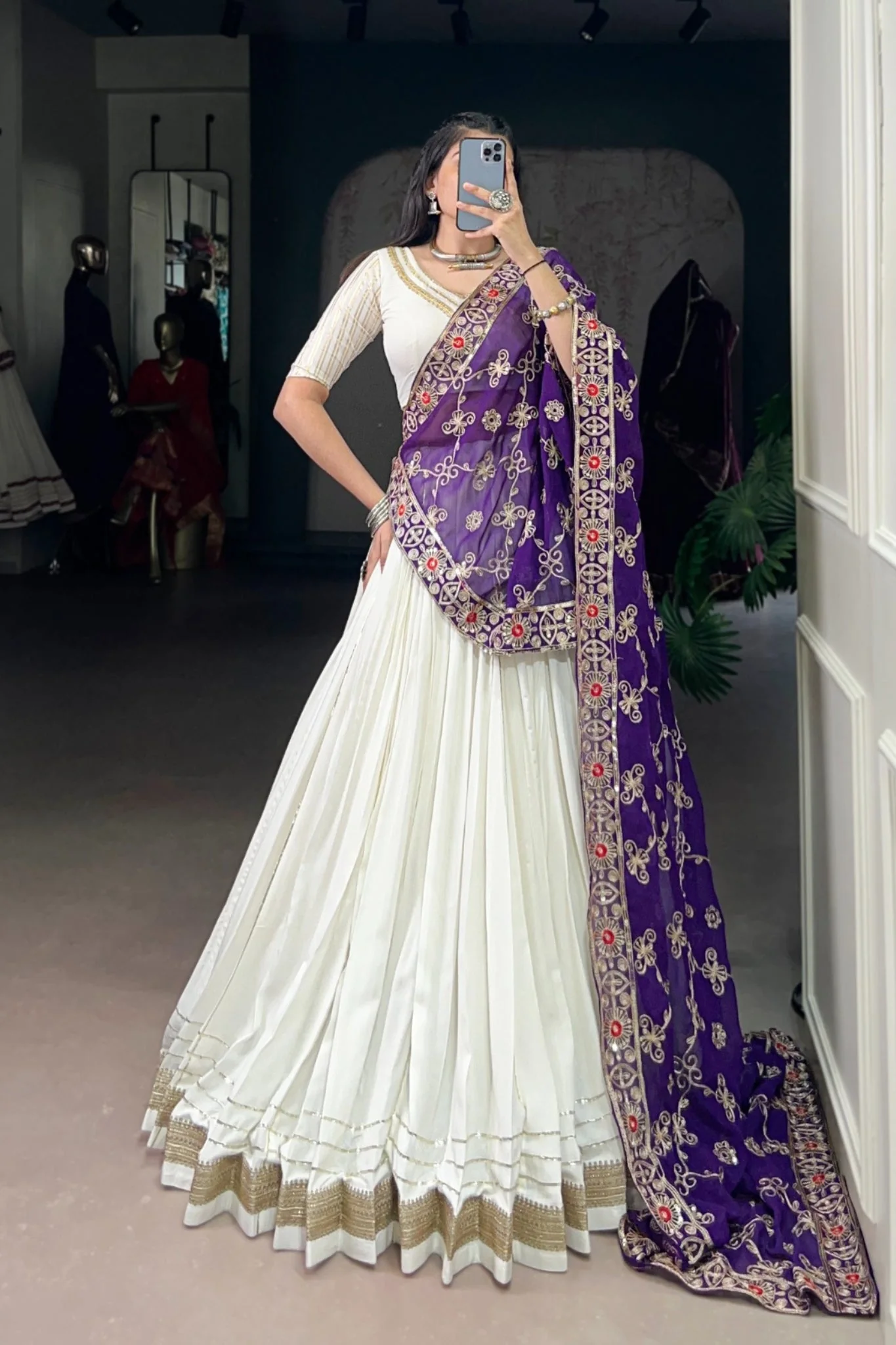 Step into the festive season with our designer rayon lehenga choli set, crafted for comfort, elegance, and endless twirls. The soft and flowy rayon lehenga pairs perfectly with a matching blouse, both designed to keep you light on your feet while embracing rich traditional aesthetics. Completing the look is a beautifully detailed georgette dupatta, adorned with intricate work that adds a graceful finishing touch. Ideal for Garba and dandiya nights, this ensemble lets you dance the night away while radiating timeless festive charm—making it a must-have for your Navratri celebrations.